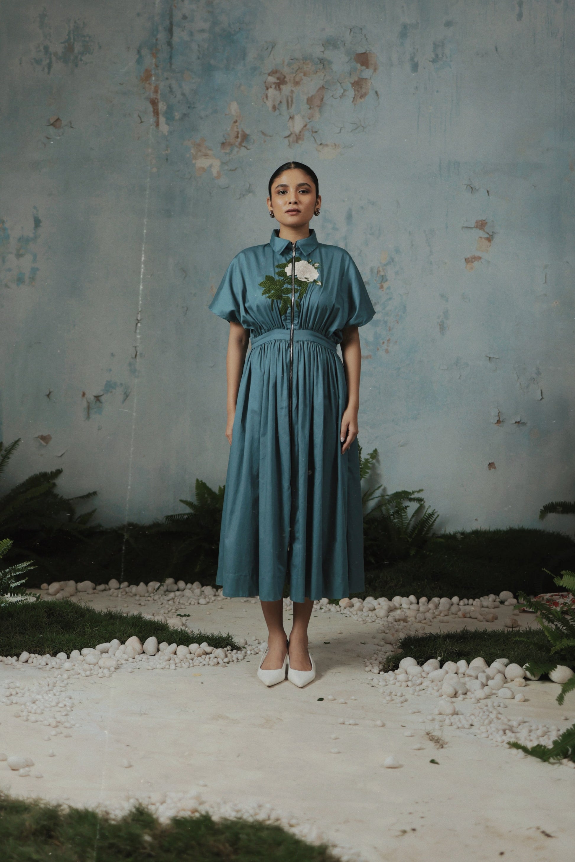A luxurious cotton satin dress in a deep lake blue, adorned with an intricate hand-embroidered white English rose. Inspired by the memory of rose covered walls against the lake’s mesmerising blue in a picturesque town in Como.