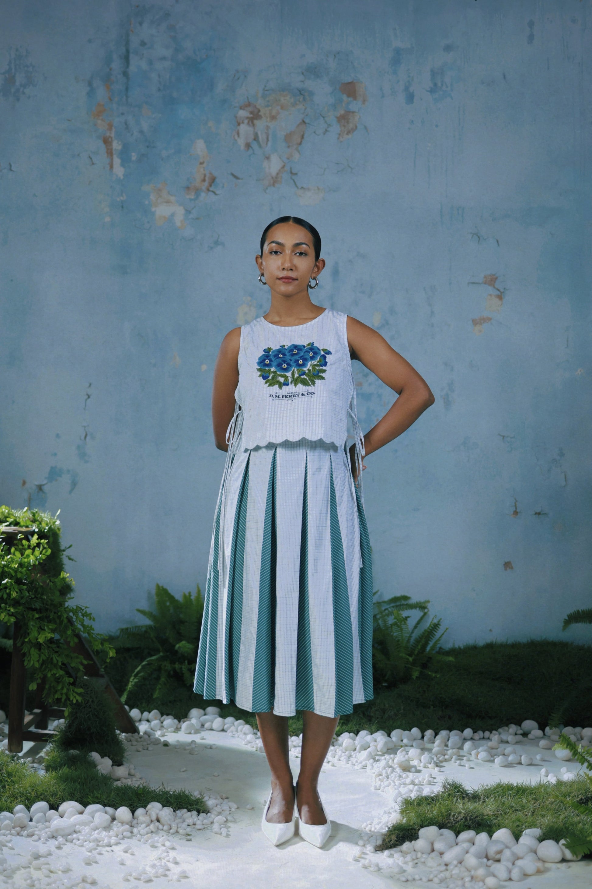 A scalloped crop top in fine line checks, finished with side-tie knots and a hand embroidered, vintage pansy motif. A poetic nod to the whimsy blooming within the concrete jungle of dreams.